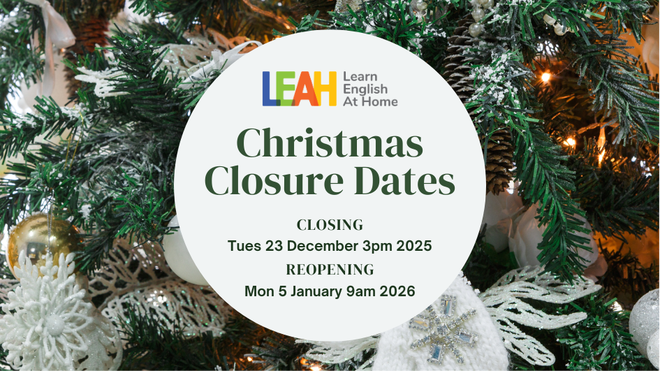 Learn English at Home will be closed for Christmas from 3pm on Tuesday 23rd December and will reopen on Monday 5th January at 9am.