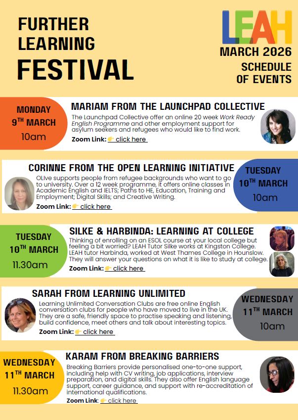 During the week of 9 - 13 March 2026, LEAH hosted an exciting online further learning festival, organised by our wonderful ESOL coordinator, Keri.